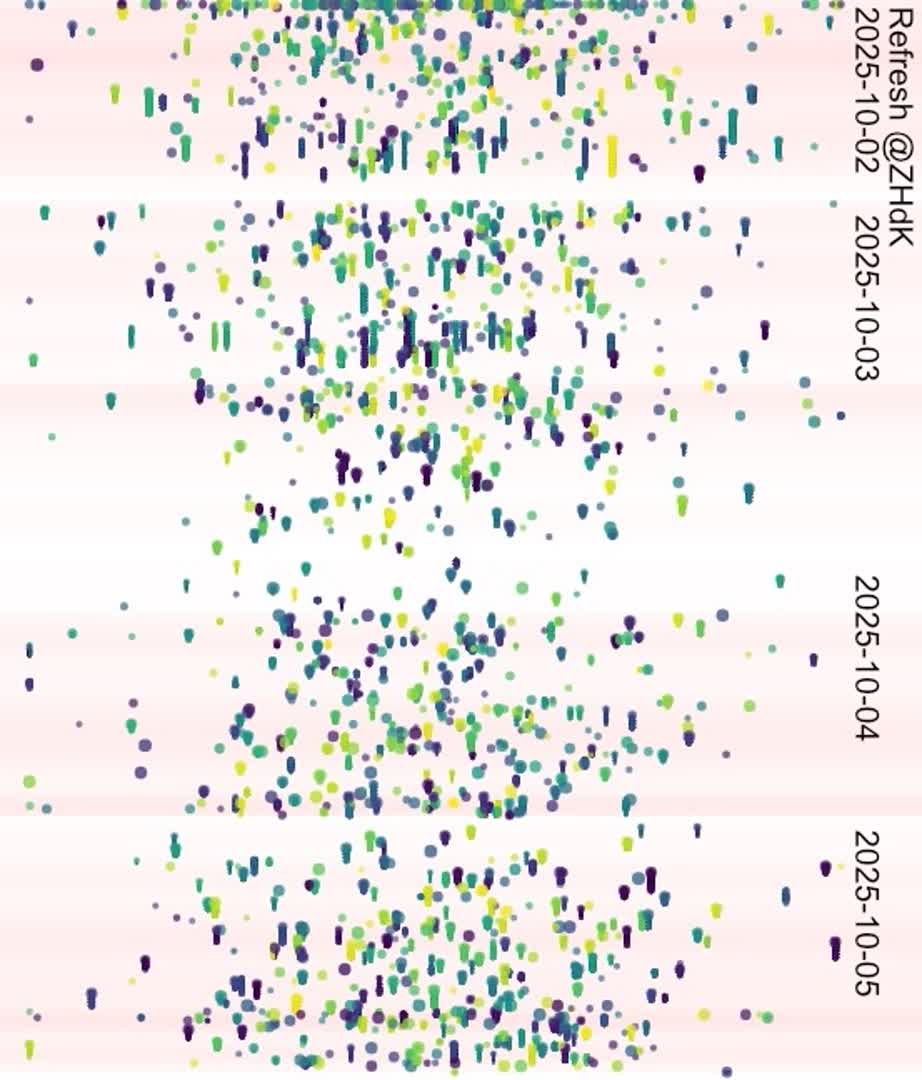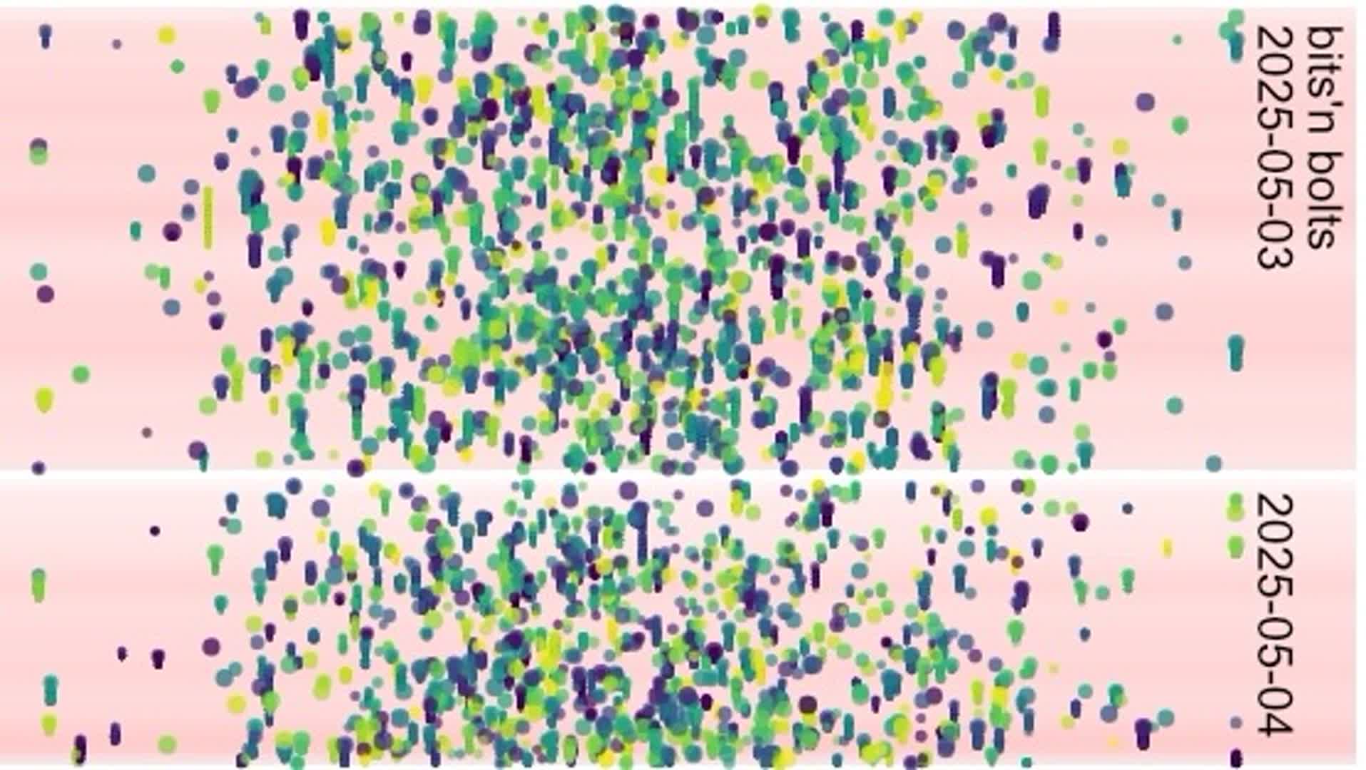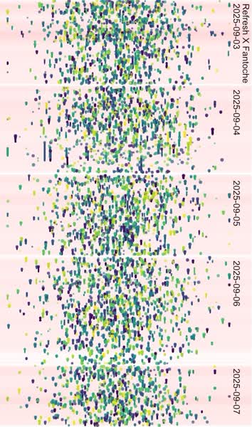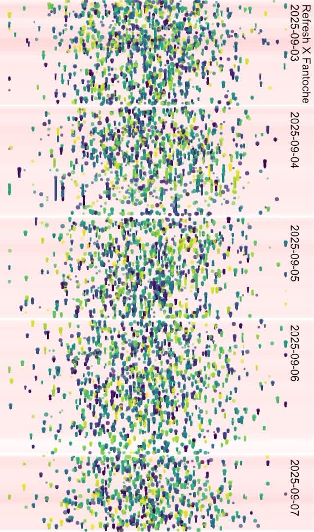 These images visualize the data collected and used during the shows: red background shows the overall Wifi and Bluetooth activity (number of unique devices and observed traffic) - translated into the general movement of the installation. Differently colored dots represent different devices (more exact: MAC addresses) - detection of new devices results in movement like gusts of wind and sound. Most devices are seen only for a short visiting time, but some seem to stick around for longer times or come back.