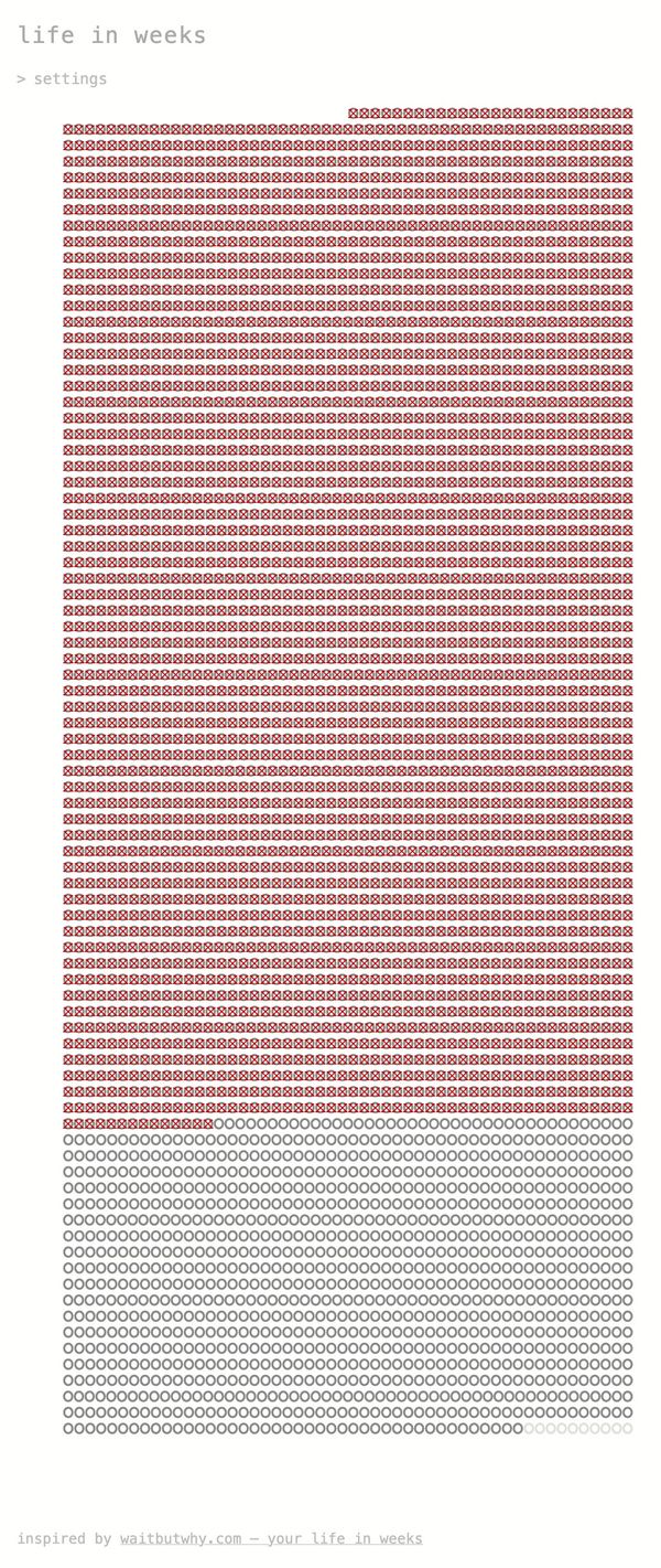 I think weeks are a nice unit to grasp, and the amount of weeks available in a lifespan is at the same time quite a lot, but also still quite limited, especially when you mark with higher age the past ones …