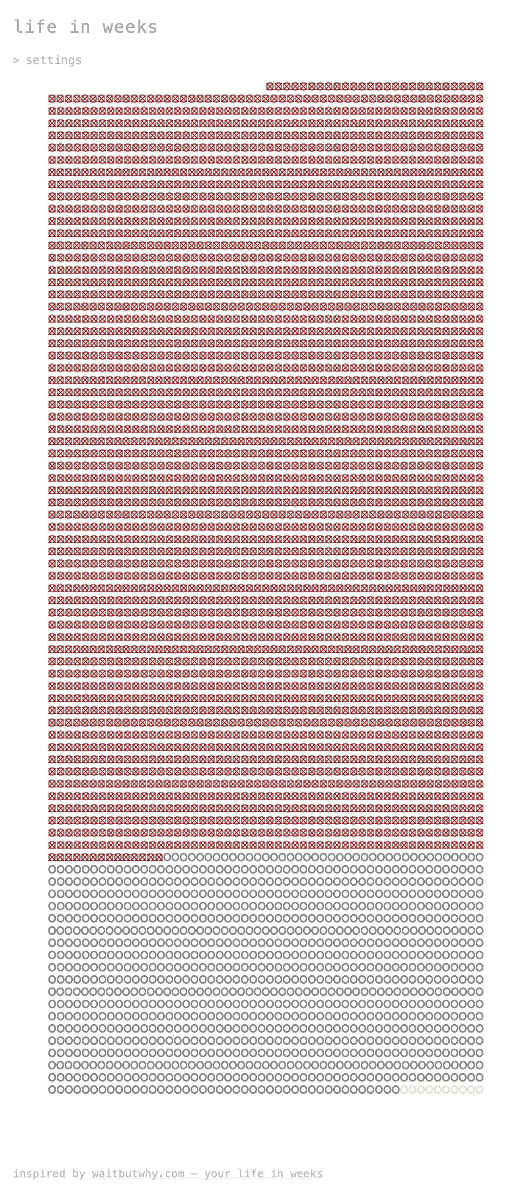 I think weeks are a nice unit to grasp, and the amount of weeks available in a lifespan is at the same time quite a lot, but also still quite limited, especially when you mark with higher age the past ones …